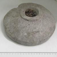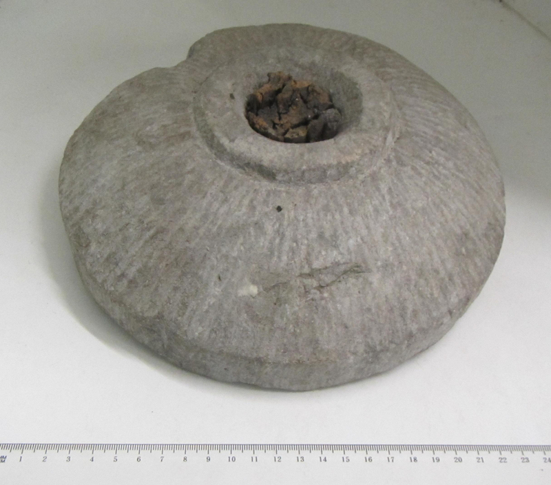 Een zogenaamde grinder molensteen, gangbaar in de periode zestiende t/m achttiende eeuw. Opvallend is dat een deel van de houten as bewaard gebleven is. Het materiaal is basaltlava ook wel "blauwe steen" genoemd. Qua afmeting waarschijnlijk voor huishoudelijk gebruik. Molenstenen bestonden uit een ligger en een loper, waarbij dit object een loper is. Betreft een schenking.
